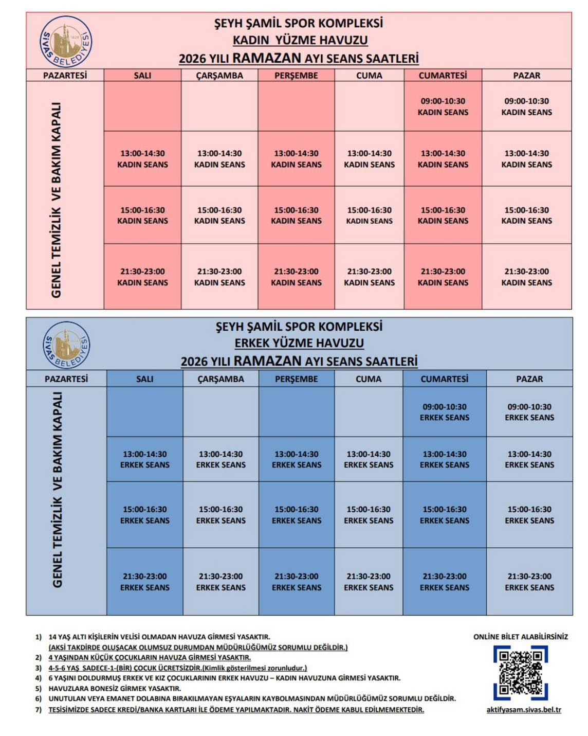 Belediyemiz bünyesinde hizmet veren Şeyh Şamil Spor Kompleksi kadın ve erkek yüzme havuzlarında Ramazan ayına özel seans saatleri belirlenmiştir. ![]()